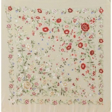 Mantón en seda, bordado y flecado a mano. Diseño muy original al ser de doble dibujo de flores pequeñas. Peso apróximado 1.060 Kg. Ideal para baile flamenco profesional y uso en eventos como bodas, ferias y salidas de noche. Ref: 783