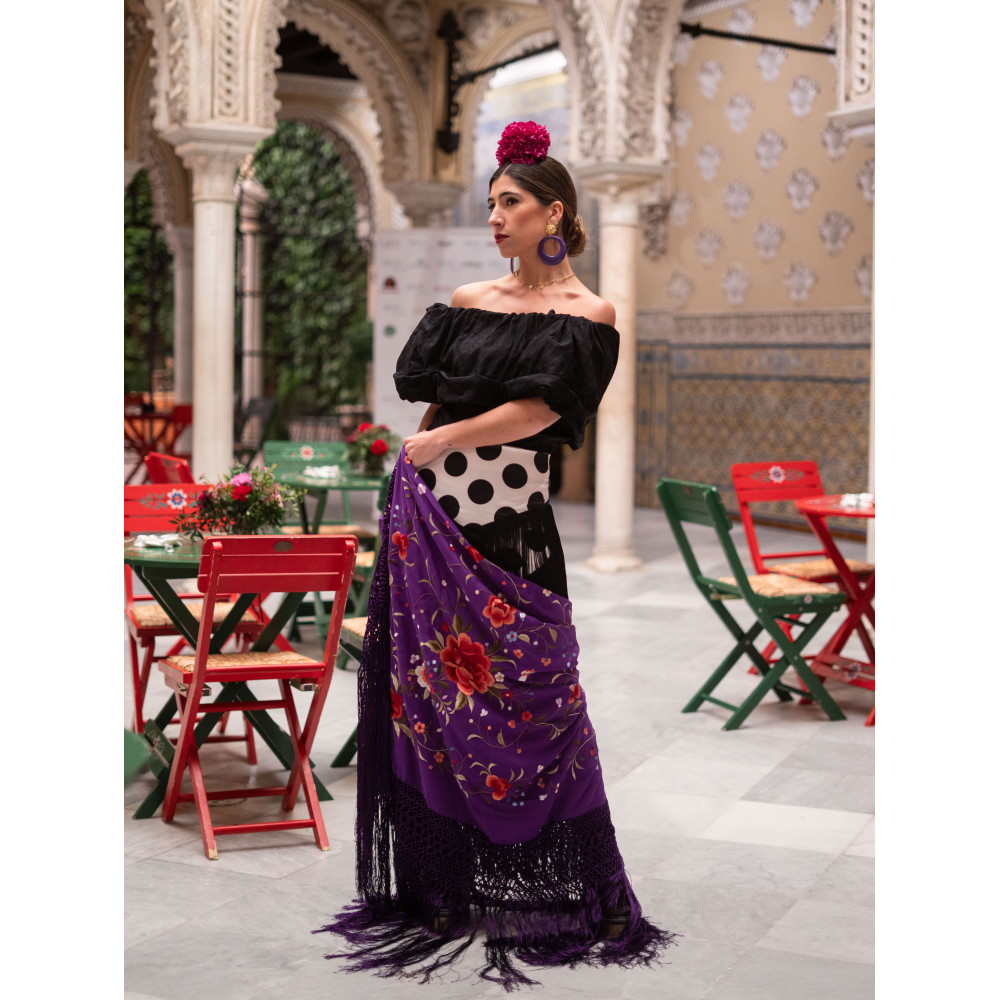 Mantón en seda, bordado y flecado a mano. Diseño de flores medianas y pequeñas. Peso apróximado 800 Gramos. Ideal como regalo personal, uso en ferias, bodas y como complemento para salidas por la noche. Ref: 811 X