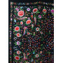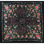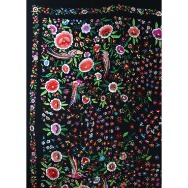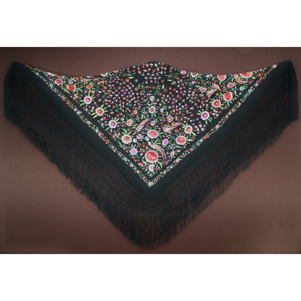 Mantón en crespón, bordado y flecado a mano. Diseño de flores medianas y pequeñas con un buen enrejado de fleco. Ideal para grandes eventos y para baile de complementos.