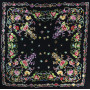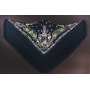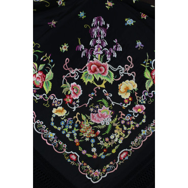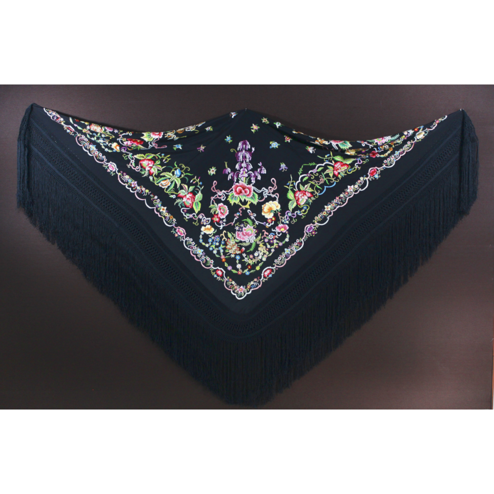 Mantón en crespón, bordado y flecado a mano. Diseño de flores medianas y pequeñas con un buen enrejado de fleco. Ideal para grandes eventos y para baile de complementos.